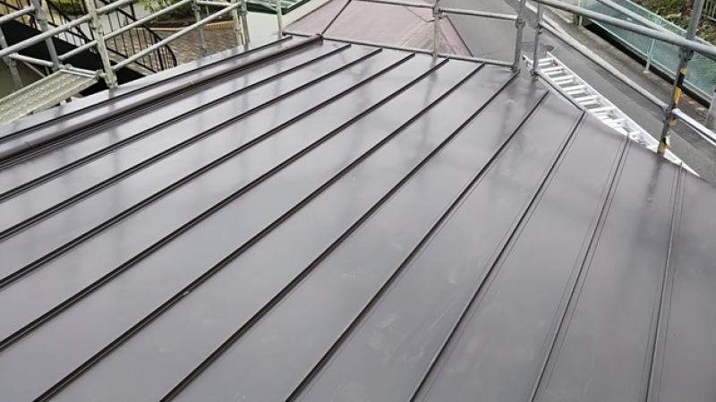 構造用合板の上に、セキノ興産の立平ロック25型を施工。軒樋・這樋・集水器の交換を行いきれいに仕上がりました。