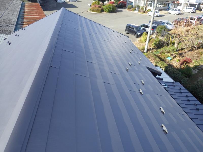 1階桟葺屋根はカバー工法で対応いたしました。合わせて雨樋の全取替えと南北面にあったポリカ波板の葺き替えも行い、