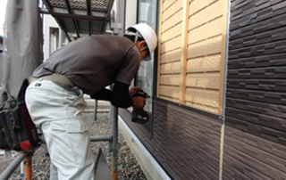 「胴縁」と呼ばれる下地材を外壁に取り付けます。この「胴縁」は壁の中に空気の通路をつくる役割も兼ねています。胴縁の上から新しいサイディングを重ね張りしていきます。縦張り専用と横張り専用の外壁材があり、縦張りサイディングの場合は横胴縁に、横張りサイディングの場合は縦胴縁にします。