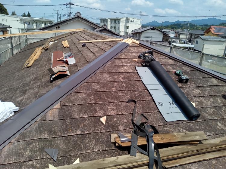 既存の棟と下地の木材を撤去し新規で棟を施工しました。