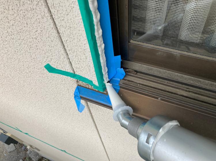 外壁目地部分は既存のコーキングを撤去し打ち替えて、サッシ廻りなどは既存のコーキングの上から増し打ちを行います。