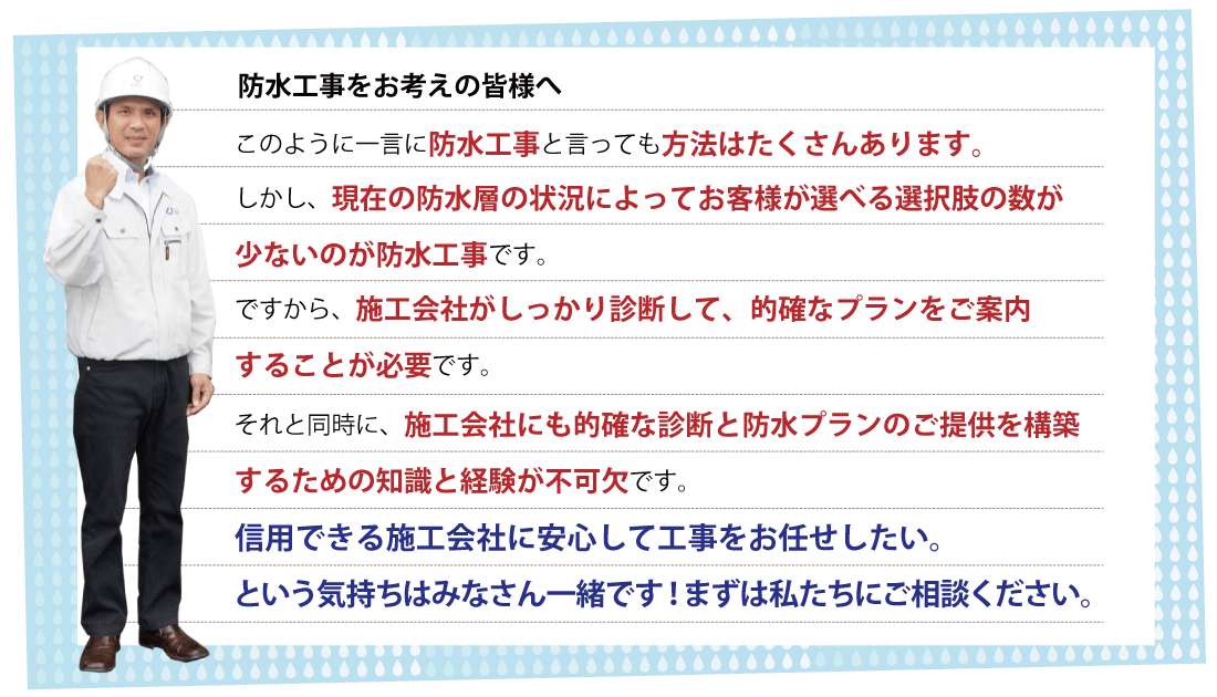 それと同時に、施工会社にも的確な診断と防水プランのご提供を構築するための知識と経験が不可欠です。